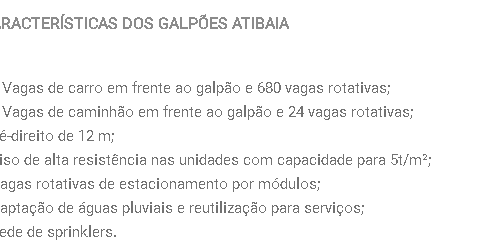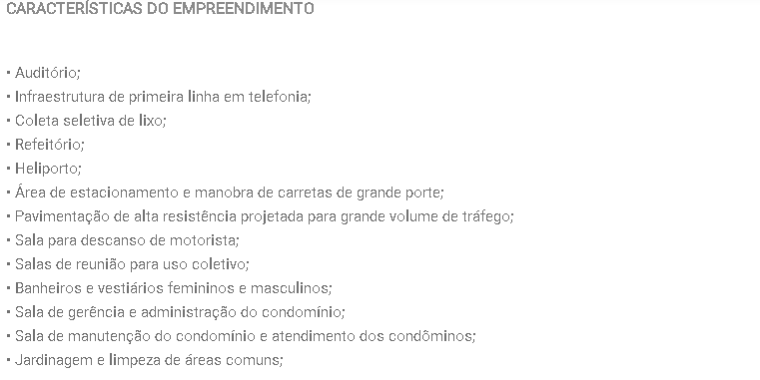 Excelente empreendimento de Galpões em modulos de 2.000 m² (152.364,43 m² de área construída); Terreno com 286.119,57 m²;Portaria social e serviço com segurança 24hs;Prédio administrativo, auditório, refeitório, sala de reunião;Heliponto; Entrada de energia separada; Galpão com pé direito livre de 12m; Piso de alta resistência para 5t/m²; Isenções de impostos e taxas; 6 Vagas de carro em frente ao galpão e 680 vagas rotativas;2 Vagas de caminhão em frente ao galpão e 24 vagas rotativas; e muito mais.